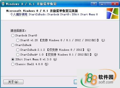 Windows 8 / 8.1 开始菜单恢复安装包集成有原版 Classis Shell 4.0 与 IObit Start Menu 8(均支持WIN8.1,免费版)。 此外,也集成了著名的 Stardock Start8 与 StartIsBack 最新版,已经过处理,安装完毕即可无限正常使用。六合一,按需选择,很给力!