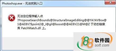 Photoshop.exe - 无法找到入口无法定位程序输入点?ProposeSearchBounds@StructuralImageEditing@@YA?AVBox@1@AEBV?$point2@_J@gil@boost@@AEBV21@M@Z于动态链接库PatchMatch.dll上。