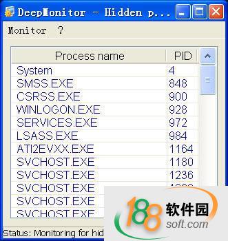 Deep Monitor可以不断查询进程列表,并把隐藏进程用红色字体显示出来,即使它只存在了0.000001秒,也逃不脱Deep Monitor的眼睛,一旦Deep Monitor发现一个隐藏进程,就会在系统托盘弹出一个提示信息,告诉你隐藏进程的名字。