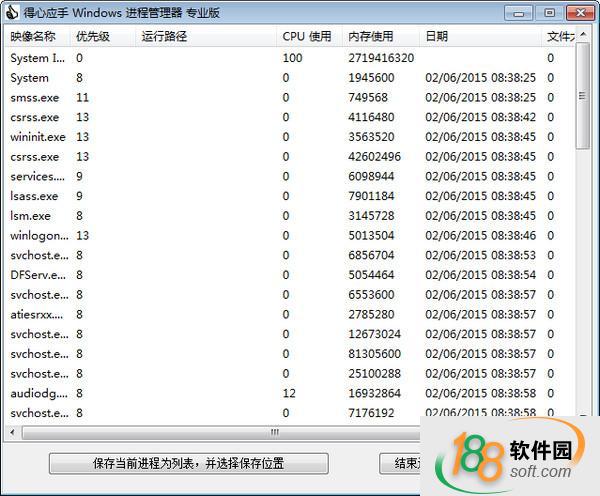 得心应手进程管理器主要功能可帮助您对电脑的各项信息进行查看包含了进程名称,优先级,路径,内存使用,CPU使用等等,同时支持对进行进行强制关闭,复制,保存等操作。