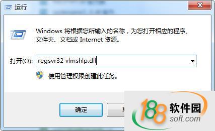 3、点击开始,在搜索栏输入运行,然后在运行对话框输入regsvr32 vlmshlp.dll,点击确定即可。