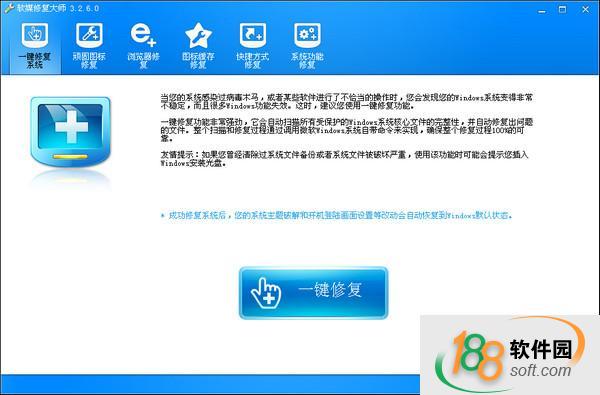 1.一键系统修复 2.顽固图标修复 3.浏览器修复 4.图标缓存修复 5.快捷方式修复 6.系统功能修复