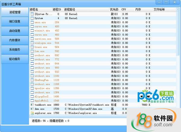 巨盾分析工具箱是从巨盾专杀工具里提取出来的系统安全分析工具,可分析系统进程和网络端口,用于常见的系统软件分析,以判断是否病毒行为,类似于PCHunter。