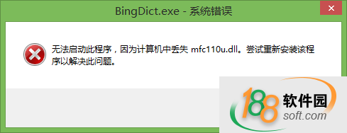 在运行软件或游戏时遇到mfc110u.dll丢失问题如下图,mfc110.dll是存放在windows系统中的一个重要dll文件,缺少它可能会造成部分软件或游戏无法正常运行。当系统提示“没有找到mfc110.dll”或“丢失mfc110.dll”等类似错误信息,请下载188soft软件园提供的dll文件,使用它可以帮助用户解决上述问题。