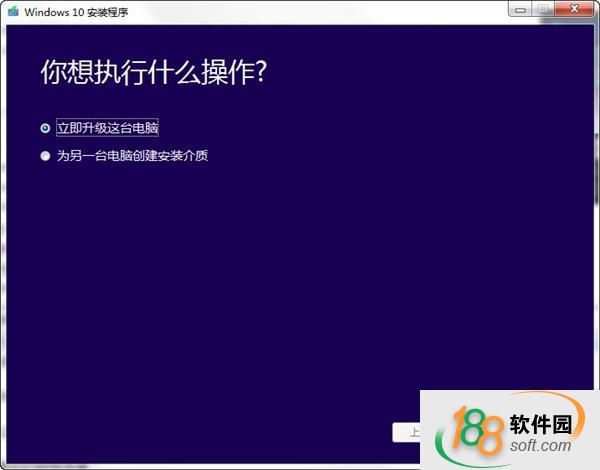 该工具提供了两个功能:“立即升级这台电脑”和“为另一台电脑创建安装介质”,如下图所示。