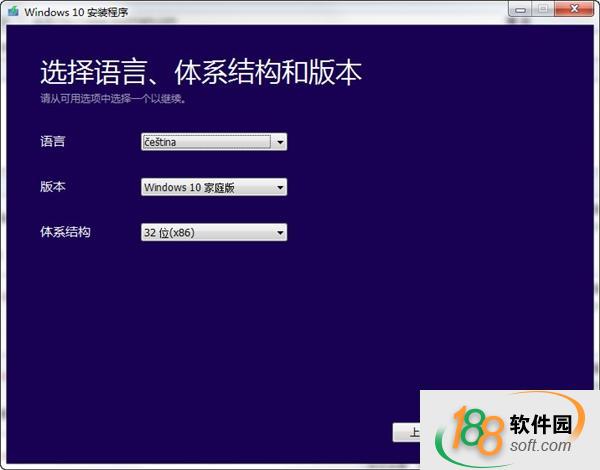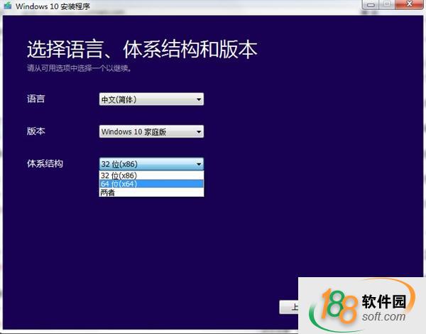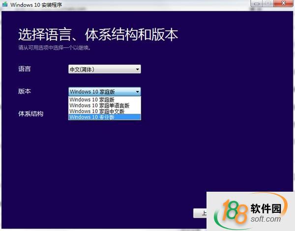 选择第二个选项后,用户可以选择语言、版本和体系结构,该工具提供了专业版、专业版N、家庭版、家庭版N四个版本下载。