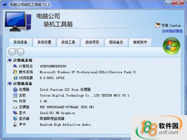 系统设置,读取系统默认设置,IE首页、用户文件夹、使用者名称、使用者单位、电脑名称、OEM厂商名称、OEM厂商地址、OEM信息内容,并且可以轻松修改,只要点击“保存当前设置”就OK。