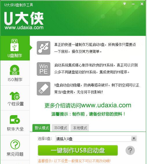 一盘两用,便捷简单! U大侠,平时当U盘使用,需要时当修复盘用,无需光驱和光盘,携带便捷。 一键制作,简单易用 没有任何繁琐的步骤,一键点击制作,制作过程简单、快速,是电脑菜鸟的好选择! 轻松更换电脑系统 用户可以自由替换系统,支持GHOST与原版系统安装,方便快捷,自动安装。