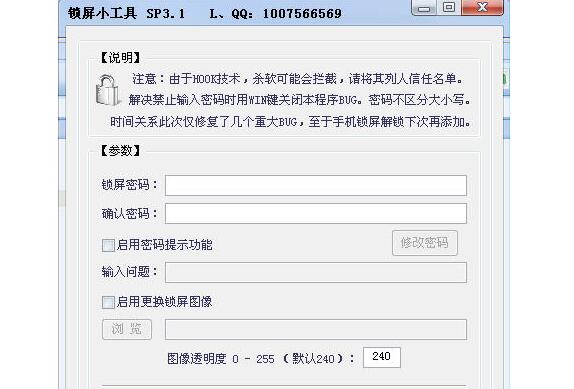 锁定【鼠标移动】:固定在右侧边上,无法移动...本来是想HOOK 鼠标,但是会出现忙状态,不知道的人还以为卡机了 - -!屏蔽【键盘输入】:HOOK 键盘屏蔽【注销按钮】屏蔽【关机按钮】:没有添加开机启动,所以重启、注销后就不会再锁屏屏蔽【更改密码】:顺道屏蔽... 屏蔽【任务管理器】:防止结束自身进程屏蔽【锁定计算机】:顺道屏蔽... 旁边【系统快捷键】:顺道屏蔽... 禁止再运行任何程序:防止程序干扰...但不会影响正在运行的程序... 新增功能介绍: 增加密码提示 更换锁屏图像 系统空闲时锁屏 锁屏时关闭显示器 快速锁屏 隐藏窗口:通过 Ctrl + Alt + Shift + F8 快捷键隐藏窗口