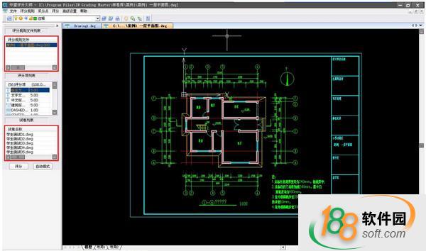 样卷管理:加载样卷库、添加、打开样卷、设置为当前样卷。 试卷设置:逐张/批量指定需要评分的考生试卷。 评分规则制定:新建、修订、保存当前评分规则、添加评分项及分数/得分权重。 自动模式评分:一次性进行多张图纸的自动评分。 向导模式评分:针对单张试卷进行分步评分。 软件配置:可以设置术语、参数、符号表、图形元素、系统变量、路径。 评分结果编辑:可以查看、修改评分结果,并支持数据导出。