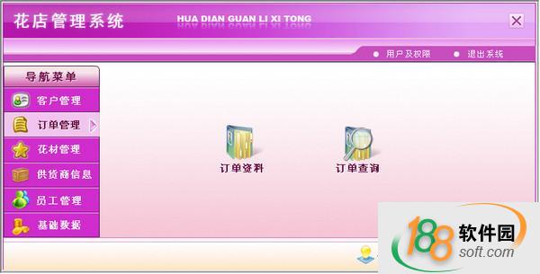 《花店管理系统》是针对各种花店经营模式进行相关业务管理的一套软件。该系统界面简洁,菜单功能一目了然。集客户管理、订单管理、花材管理、员工管理、基础数据于一体,具体包含来电日志登记、添加客户、来电日志查询、客户资料查询、订单资料录入、订单查询、花材设置、花材查询、添加员工、员工资料查询、员工出勤考核、及查询和基础数据的设置等。有助于花店管理业务便利开展,提高工作效率,提升服务质量。