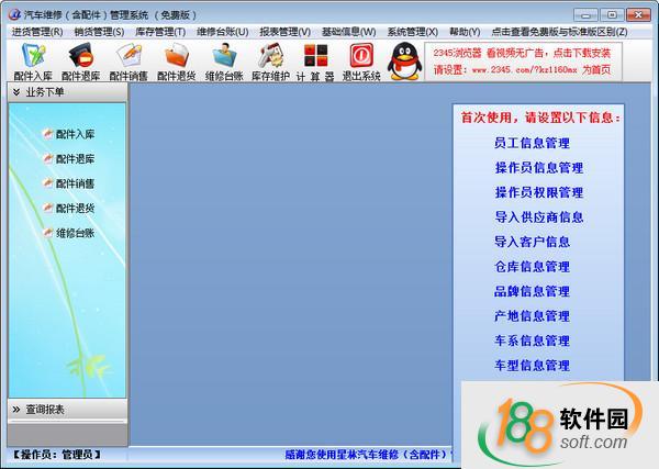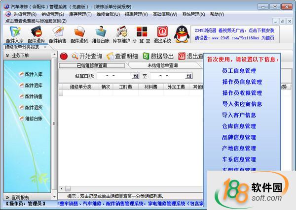 汽车维修(含配件零售)管理系统是一款专门管理汽车维修和配件的软件,它适用于所有汽车维修及配件销售门市、公司,从车辆进厂的接待、派工领料到 车辆的维修、结算出厂,以及对维修车辆的报表统计,此软件提供了完整的管理解决方案,同时软件对仓库功能延伸增加了仓库的配件零售功能。软件界面简洁,操作简单,在主功能界面都有视频操作演示,并且此版本为真正的免费版,在使用时间及功能上无任何限制,您可放心使用。