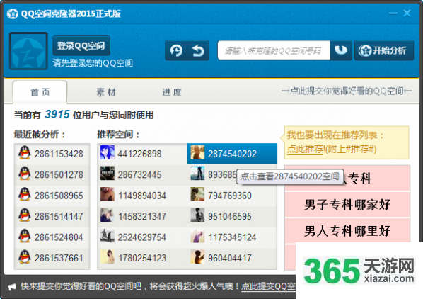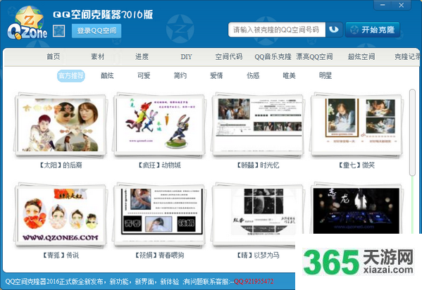 4、如果你没有克隆素材的话,也不用着急,在首页内有众多的QQ账号可供你选择,如果你向自主选择克隆素材,一样可以!在素材办款内提供了最新、最热门的空间克隆素材可供你自由选择!还没完哦,在进度选项你还可以查看克隆的进度,自由按安排自己的时间,是不是酷毙了!!!