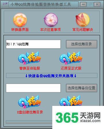 小坤炫舞体验服转换器是一款绿色、无毒的qq炫舞体验服转换器,本款体验服转换器具有一键快速替换qq炫舞文件 bin/config 里面所在服务器地址的功能,可以让玩家省去手动找寻文件复制替换的不必要的麻烦。