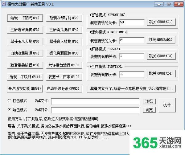 植物大战僵尸是针对植物大战僵尸游戏中属性修改器。植物大战僵尸可以轻松地修改游戏中的很多属性,比如说无限阳光、3倍墙果抵挡。植物大战僵尸是一款中文版的属性修改器,玩家必备的辅助工具,开启后即可拥有无敌的植物大战僵尸秘籍,可以让你在游戏中更加游刃有余,体会不一般的游戏感觉。此部游戏曾掀起一阵狂潮,当然,该辅助性游戏软件受到众多单机游戏玩家的青眯。