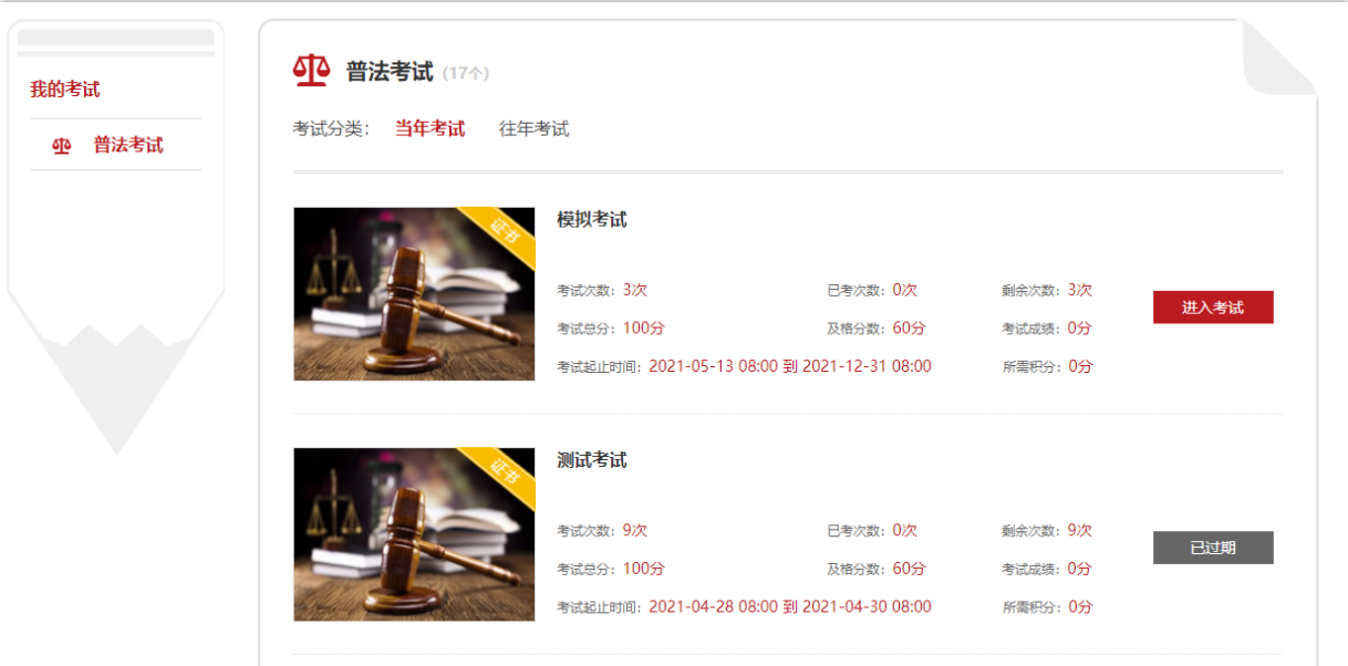 点击学员首页“进入考试”图标或者点击导航进入到考试列表页面,该页显示为所有考试列表,包括每场考试的考试次数、已考次数、剩余次数、考试总分、及格分数、考试成绩、考试起止时间、所需积分。有考试行业标签,以及是否获得证书。
