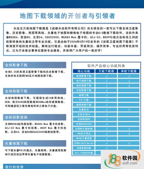 仔细说来,其中最重要的功能主要包括高清卫星影像下载、影像拍摄日期查看、高清历史影像下载、原始高程数据下载、高程等高线提取、道路沿线下载、大字体地图下载、矢量兴趣点(POI)下载、全球矢量路网下载、全国建筑轮廓下载、影像矢量投影转换、导出无限制大图(可分块导出)、导出瓦片(可重投影)、导出地图离线包、矢量点标注、矢量路径绘制、矢量面状轮廓绘制、国家标准分幅图幅下载、即时查看下载结果、地形地貌渲染图下载、10米等高线栅格地图下载、丰富多样的地图资源、虚拟三维地形地貌在线查看、矢量数据与影像在CAD中完美叠加、矢量数据与影像在ArcMap中完美叠加、支持影像数据裁剪和背景透明、支持高程数据裁剪和背景透明等强大功能。