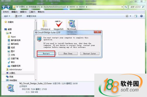 10、安装完成后会弹出一个提示重新启动的窗口,我们直接选【restart】,重新启动。