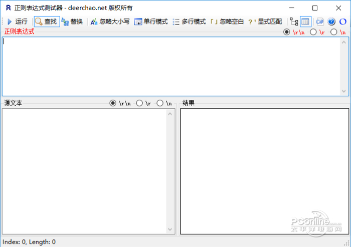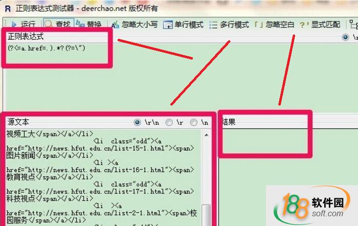 1、打开软件,在“正则表式框”中写出你的正则表达式,点击“运行”,匹配出的字符串就在右侧中一一展现