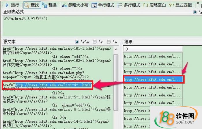 1、在“匹配出的字符串框”中点击某一行,左边会显示对应的原字符串所在的位置