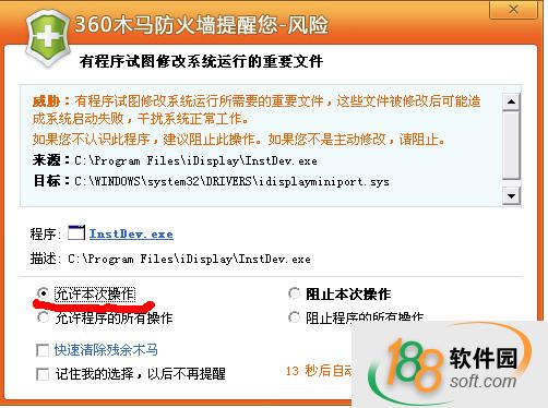 4、如果有360木马防火墙提示,请点击“允许本次操作”,再确定