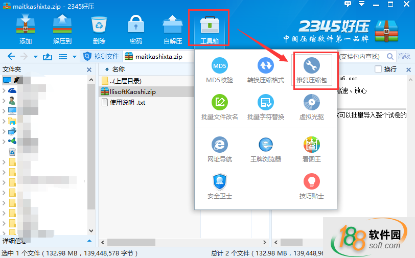 2、在好压页面中点击需要修复的文件,然后点击【工具箱】,选择【修复压缩包】;