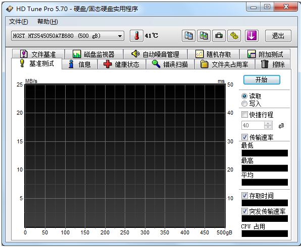 HD Tune Pro一款移动硬盘检测工具,有硬盘传输速率检测,健康状态检测,温度检测及磁盘表面扫描,还能检测出硬盘的固件版本、序列号、容量、缓存大小以及当前的Ultra DMA模式等功能。