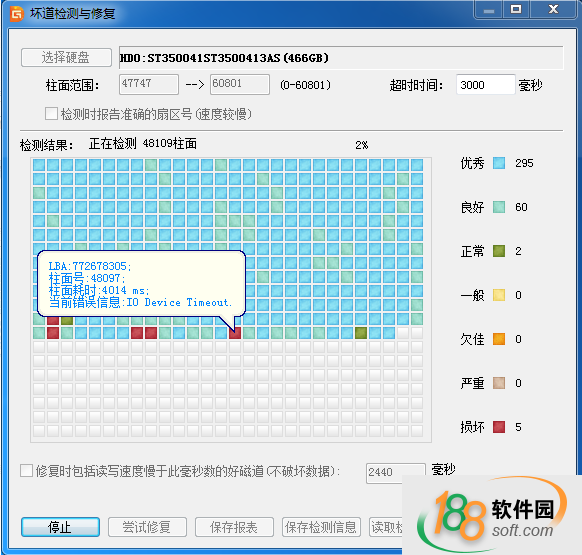 3、先选择要检查的硬盘,设定检测范围(柱面范围)。点击“开始检测”按钮,软件即开始检测坏道。发现坏道时会将坏道情况显示在对话框中。