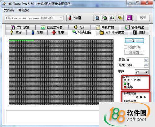 3、扫描进行中,注意软件的右下方,第一个红框内是硬盘检测的健康图里,绿色代表健康的数量,红色则代表坏道