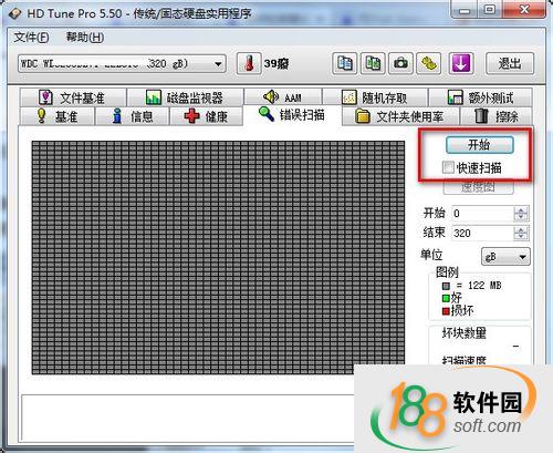 2、点击选项卡切换至错误扫描,如图,然后在红框位置,尽量不要勾选“快速扫描”的情况下点击开始,因为快速扫描速度固然会很快,但是就像杀毒软件一般,快速扫面并不能将深层次的病毒扫描出来一样,这里面的快速扫描也不能最真实的反映硬盘的真实坏道状况。