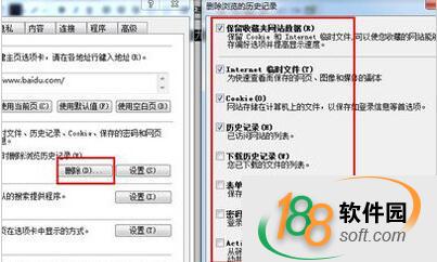 清理IE缓存:在开始菜单点击【控制面板】,选择【Internet选项】,切换到【常规】选项卡,点击【浏览历史记录】栏中的【删除】按钮,勾选如图所示,选择后点击【删除】命令