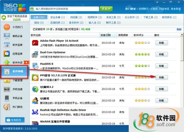360强力卸载软件是360安全卫士中的卸载应用软件。360软件卸载工具能帮助彻底卸载一些无法正常卸载的软件和流氓软件。188软件园为您提供360软件卸载工具官方版下载,欢迎有需要的小伙伴前来下载。