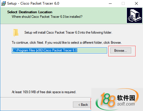3、选择Cisco packet tracer安装位置。点击【浏览】,选择软件的安装路径;或者直接点击【下一步】,软件会安装在默认的位置。
