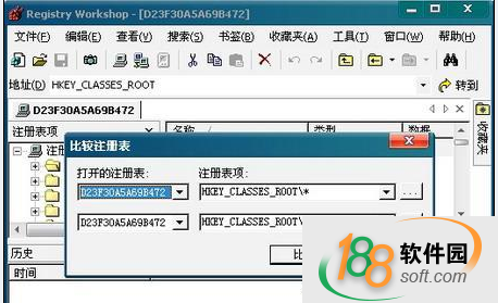 2.Registry Workshop中提供了一个较同类软件中没有的功能,名为"比较注册表",顾名思义,该项功能可以将用户所选择的一对注册表进行比较然后经过分析后将相同项和其他等信息显示在软件下方的对话框中。