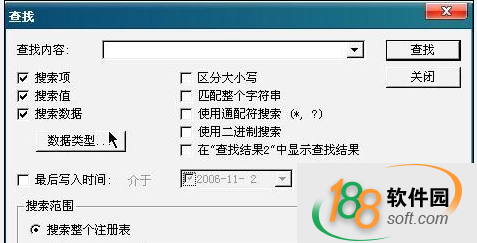 查找功能较为全面,其中的一些查询细则也是比较详细的,可以按照项、值、数据,进行查找,也可以按照一些键值属性进行查找,同时还提供了查找的时间范围以及搜索文件范围,搜索速度较快。