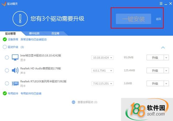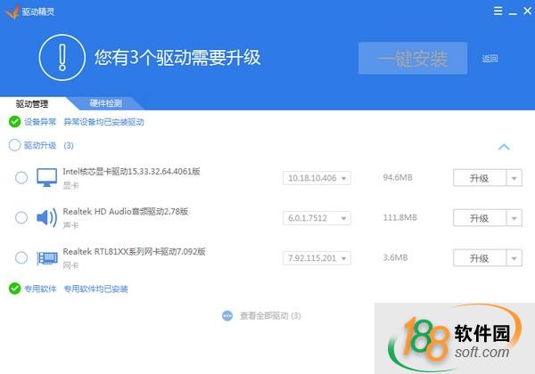 3、可以看到检测出,所有的软件都已经安装,有三个驱动需要升级,
