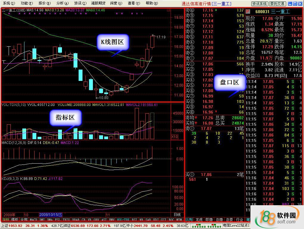 分析图K线界面:输入股票代码或者行情界面按回车,直接进入到个股分析图界面,即K线界面。我们将该界面分为三个区域,右侧的盘口区,左侧K线图区和指标区;