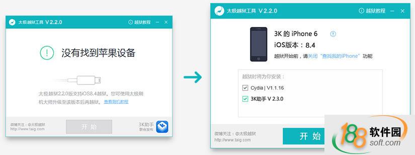 1、开始越狱,打开太极越狱工具并连接苹果设备