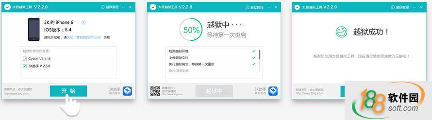 2、点击”开始”进行越狱。在越狱过程中,请保持设备连接正常并耐心等待。越狱成功后,建议安装并启动3K助手,以帮助您一键安装海量应用/游戏/插件/壁纸/铃声,安心享受越狱后的精彩!