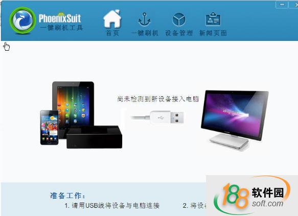 运行PhoenixSuit 程序时默认进入的第一个模块,也可以通过点击按钮 进入主页界面。