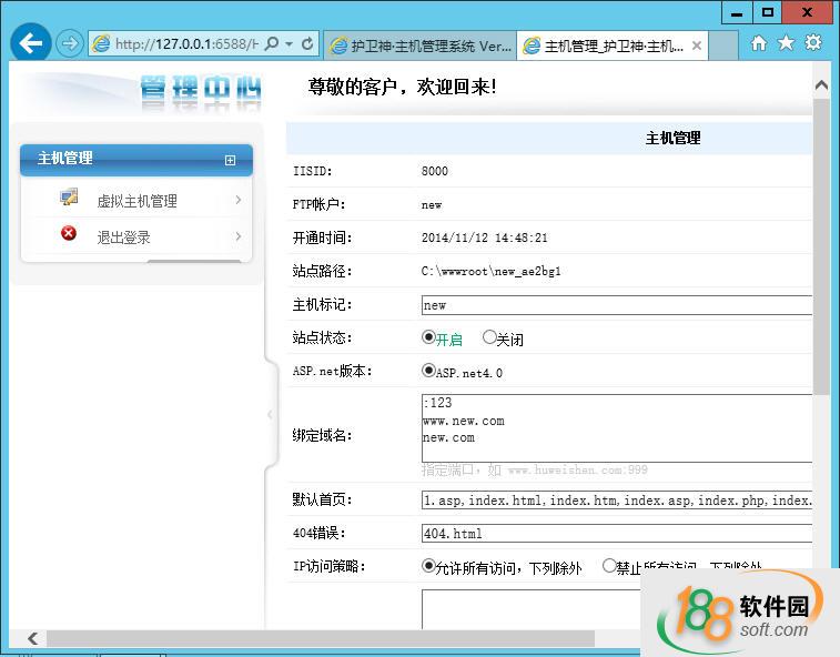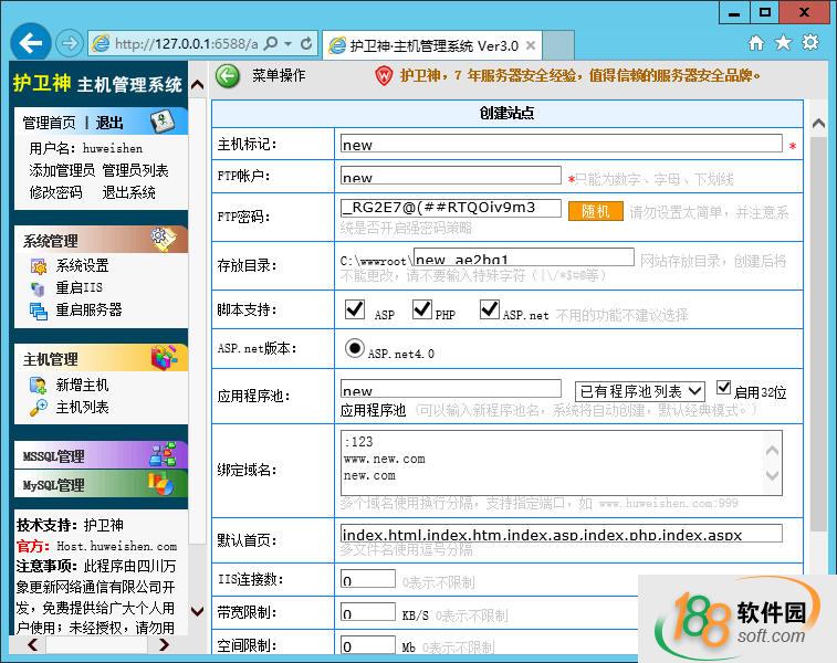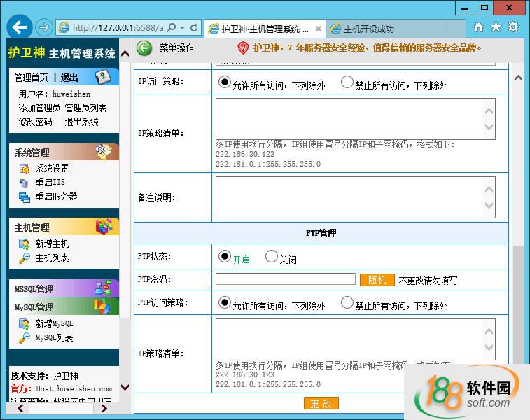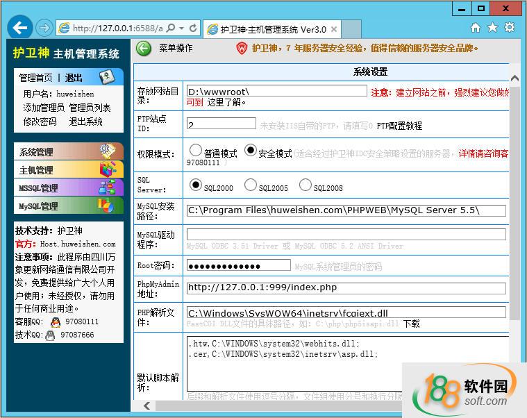护卫神.主机管理系统 是一套为方便广大用户管理服务器而开发的软件,支持开设主机、SQL Server2000/2005、MySQL。
