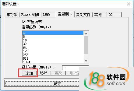 (3)请选择“容量调节”,在这里选择你的 U 盘的容量;如果在这里没有你所要的容量,请单击“添加”,填写你所需的容量。