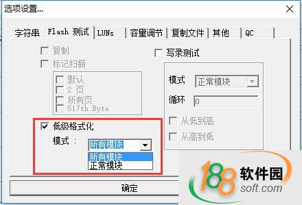(4)请选择“Flash测试”,选择“低级格式化”;这里有两个参数,一个是“所有模块” (它的意思是低格式化整个盘),另一个是“正常模块” (它的意思是只低格式化好的区块,这个参数适合于含有坏区的U盘)