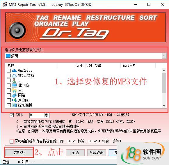 1、打开mp3修复工具,在选择框中勾选想要进行修复的MP3文件