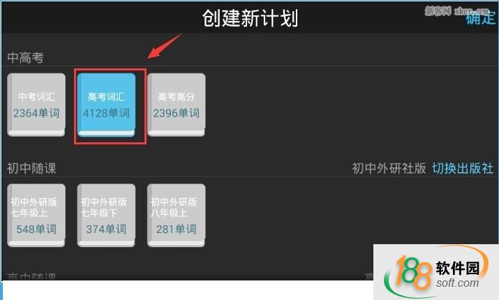 2、登陆成功后选择你需要背的词汇内容后点确定(主要包括初中及高中全部词汇);