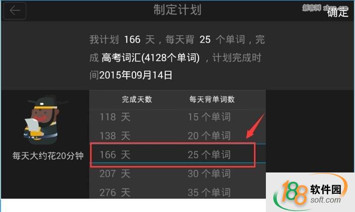 3、制定你打算你的学习计划,如多少天,每天背多少个单词等,选择好后点击确定即可;
