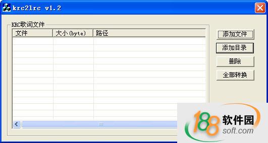 1、下载解压文件,找到krc2lrc.exe双击打开该文件,界面功能如图所示,点击添加文件,选择需要操作的项目