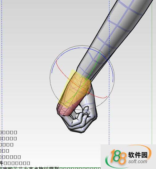 4.例如选中腰部的块,出现的三色线即为操纵用的旋转轴,鼠标左键按住沿着圆拖动即可按圆的方向旋转,