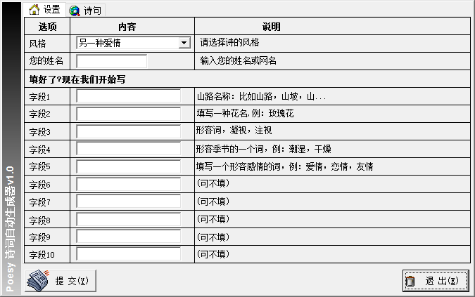 诗词自动生成器是一款非常有趣的现代诗自动生成工具,它能够根据你填写的关键词自动作出一首优美的诗词句,让你能够在妹子眼里瞬间变成一个文艺青年。当然你也可以恶搞一番,填写有趣的关键词,没事,照样能帮你写出一个充满浓浓恶搞风味的诗词,是一个功能非常强大的自动作诗软件。