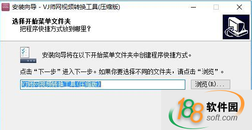 4、选择vj师网视频转换器开始菜单文件夹,一般默认即可,点击“下一步”;